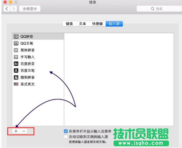 在輸入源窗口的左側(cè)即可看到當(dāng)前系統(tǒng)中安裝的所有輸入法了,如果要添加新輸入法請點擊左下方的“+”按鈕。