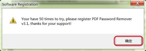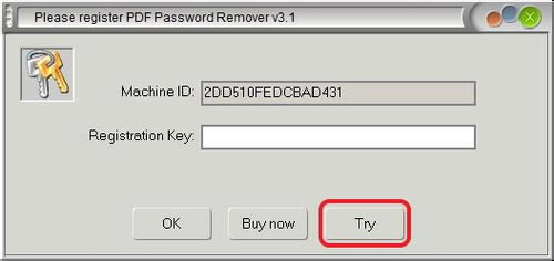 運(yùn)行安裝完成的PDF Password Remover 3.0后,會(huì)有如下提示,點(diǎn)擊紅框中的“Try”按鈕。