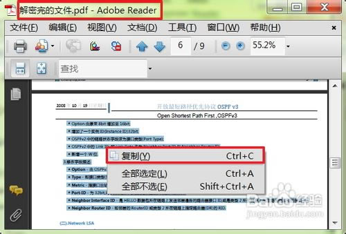 從下圖第一個(gè)紅框中可以看出,打開的PDF文件不再提示“已加密”字樣。在第二個(gè)紅框中可以看到已經(jīng)有了“復(fù)制(Y)”的選項(xiàng),也就是現(xiàn)在可以對(duì)PDF文件中的內(nèi)容進(jìn)行復(fù)制了。