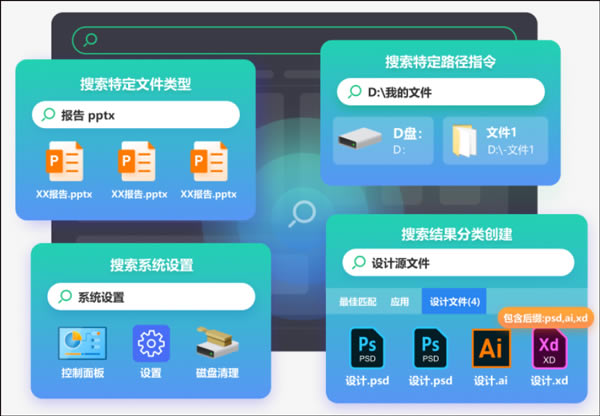 為了讓用戶快速找到想要的文件,小智搜搜提供了一些簡單實用的搜索指令,支持快速搜索系統盤符、文件或應用等。